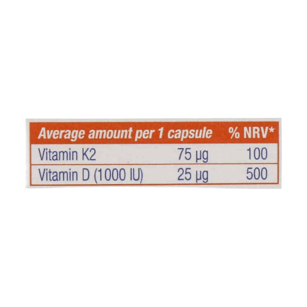 در ترکیبات این محصول دو ویتامین D و K2 وجود دارد. ویتامین د3 موجود در آن باعث افزایش جذب و کاهش دفع کلسیم میشود و نقش مهمی در حفظ کلسیم مورد نیاز بدن ایفا میکند. علاوه بر این، ویتامین د3 با تحریک استخوان سازی و جلوگیری از خروج کلسیم از استخوانها نیز باعث افزایش توده استخوانی و پیشگیری از پوکی استخوان میشود.