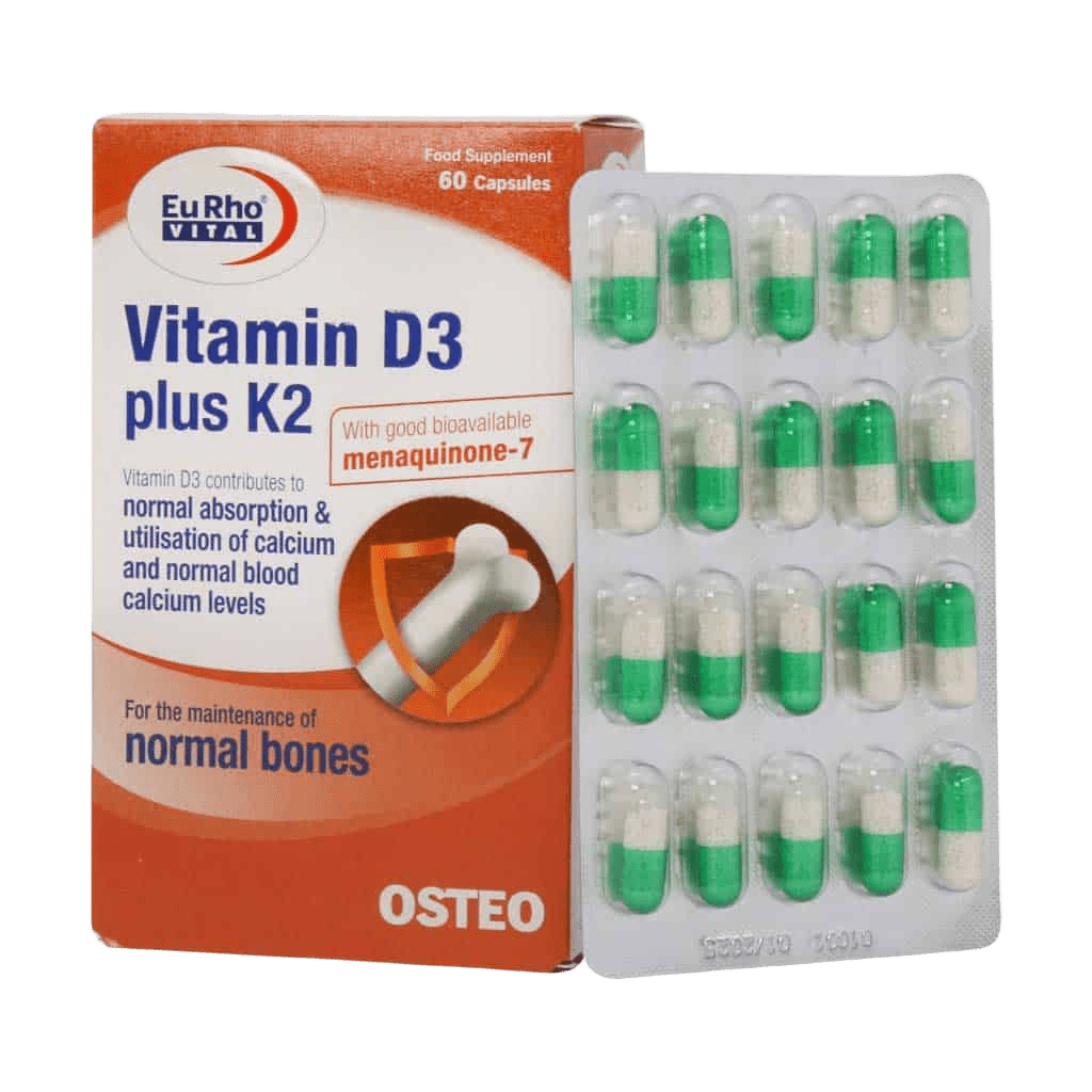 کپسول ویتامین D3 1000 پلاس K2 یوروویتال با داشتن دوز مناسبی از دو ویتامین د3 و کا2 محصولی مناسب جهت حفظ سلامت استخوان است. ویتامین د3 موجود در این محصول جذب کلسیم را در بافت دندانی و استخوانی افزایش میدهد و همین امر سبب شده است تا خطر ابتلا به بیماریهای استخوانی از جمله پوکی استخوان کاهش پیدا کند. علاوه بر این، ویتامین K2 در استخوان سازی، پیشگیری از رسوب کلسیم در عروق خونی نقش موثری دارد و در حفظ سلامت قلب و عروق موثر است. خوشبختانه ساختار قرص ویتامین د3 به صورت آهسته رهش است و جذب و اثربخشی بالاتر و عوارض گوارشی کمتری دارد.