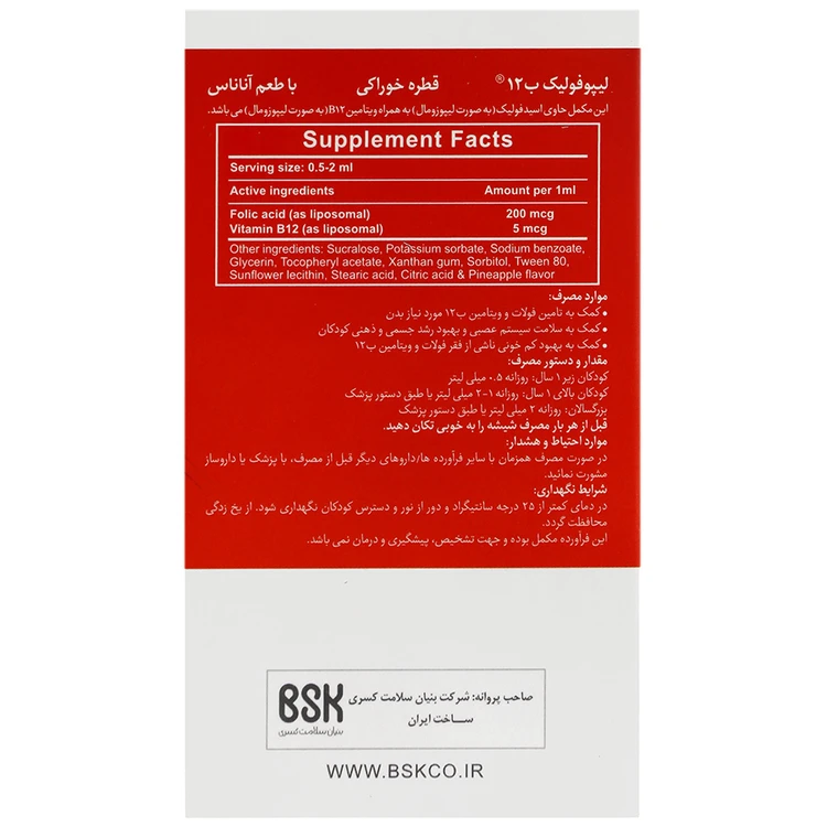 قطره لیپوفولیک ب12 بدون گلوتن، الکل و رنگ مصنوعی طراحی شده است و از این نظر می تواند برای طیف گسترده ای از افراد سازگار باشد. لیپوفولیک B12 برای کمک به پذیرش بهتر، با طعم آناناس همراه است. لیپوفولیک ب12 بی اس کی (BSK) در بطری های شیشه ای قطره چکان دار 30 میلی لیتری، توسط شرکت بنیان سلامت کسری در ایران تولید می شود.