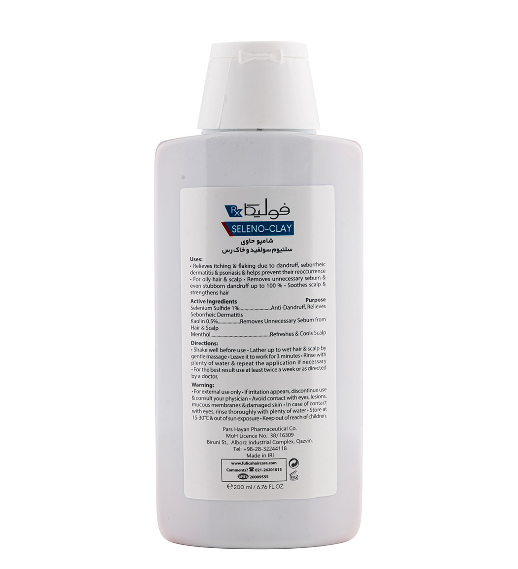 - شامپو حاوی سلنیوم سولفاید و خاک رس فولیکا، از زمان باز شدن درب، به مدت 12 ماه قابل استفاده است.