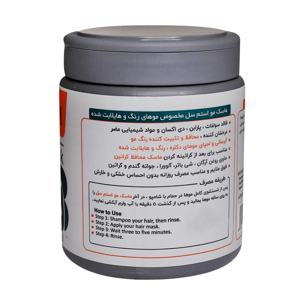 ماسک مو استم سل مخصوص موهای رنگ شده و هایلایت شده فرموله شده و غنی شده از مواد تقویت کننده مو است. این ماسک مو فوق ملایم بدون ایجاد احساس خشکی و خارش پوست سر مناسب مصرف روزانه خانمها است. بانوانی که موهای خود را کراتینه، رنگ، دکلره و هایلایت کردهاند میتوانند با هدف تثبیت رنگ مو و حفاظت از موهای خود از این محصول با کیفیت استفاده کنند. از دیگر مزیتهای خرید ماسک مو آبرسانی و احیای مو است. این ماسک مو فاقد پارابن، دی اکسان، مواد شیمیایی مضر و سولفات بوده و هیچ گونه عوارض و آسیبی برای موها به دنبال ندارد.
