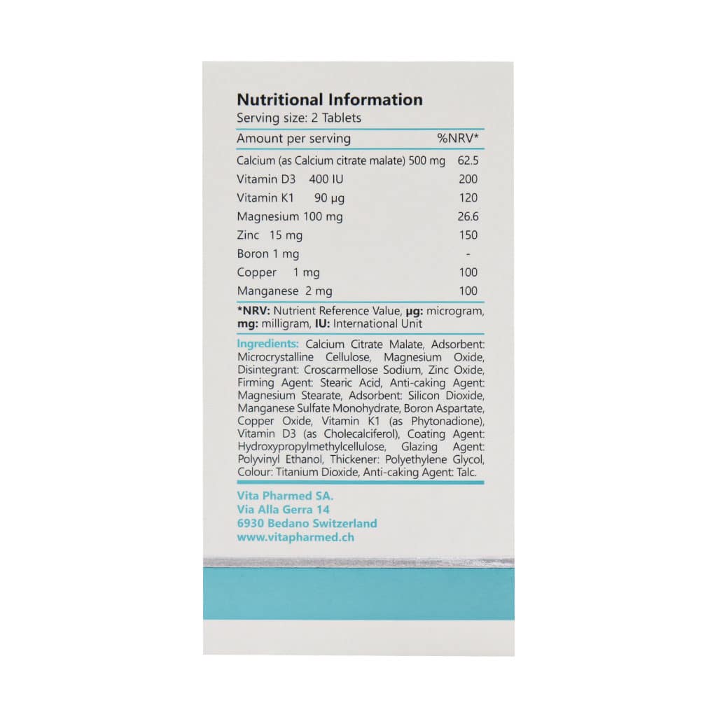 کلسیم سیترات Calcium (as Calcium citrate malate): مهمترین ماده معدنی بدن، شرکت در تشکیل استخوانها و غضروفها، کاهش احتمال ابتلا به پوکی استخوان